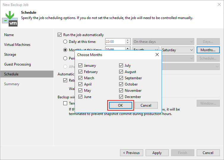 - Keep monthly full backups for : Mounthly ( Aylık ) olarak Restore Point ( Geri Yükleme Noktası ) tutmak istiyorsanız, Mounthly ( Aylık ) olarak Full Backup ( Tam Yedek ) korumak için bu seçeneği seçebilirsiniz. Restore Point ( Geri Yükleme Noktası ) değiştirilmesini ve silinmesini önlemek istediğiniz Mount ( Ay ) seçerek yapılandırma yapılandırabilirsiniz.