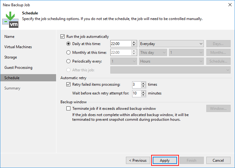 Schedule ekranın da Daily at this time olarak yapılandırmayı tamamladıktan sonra Apply diyerek Backup Job oluşturarak başlatıyoruz.