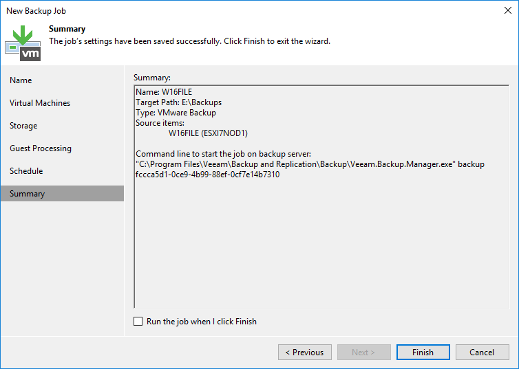 Summary ekranın da Run the job when I click Finish seçeneğini işaretliyoruz ve Backup Job yapılandırma işlemi tamamlandıktan sonra otomatik olarak başlamasını sağlıyoruz.