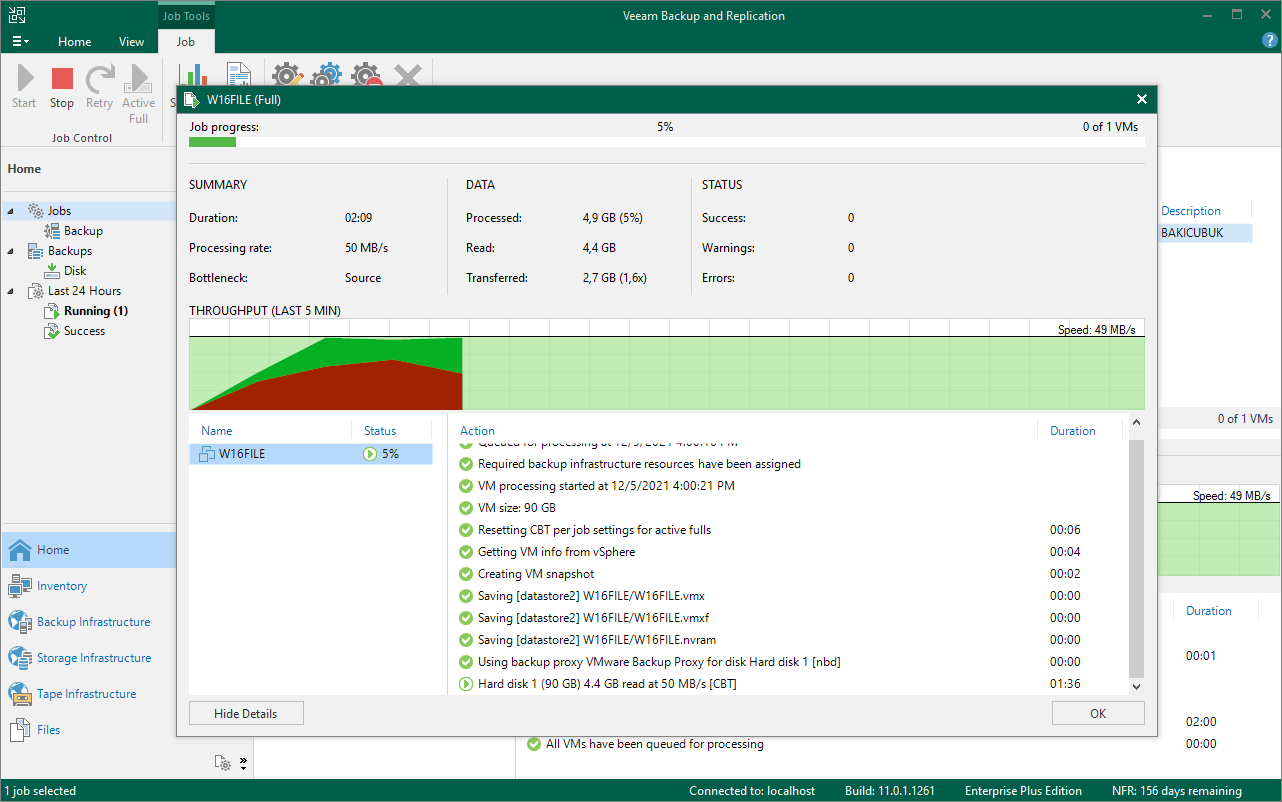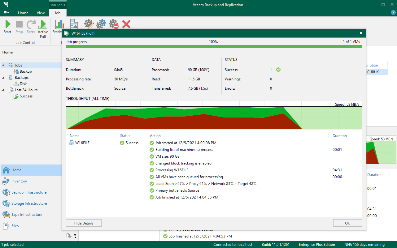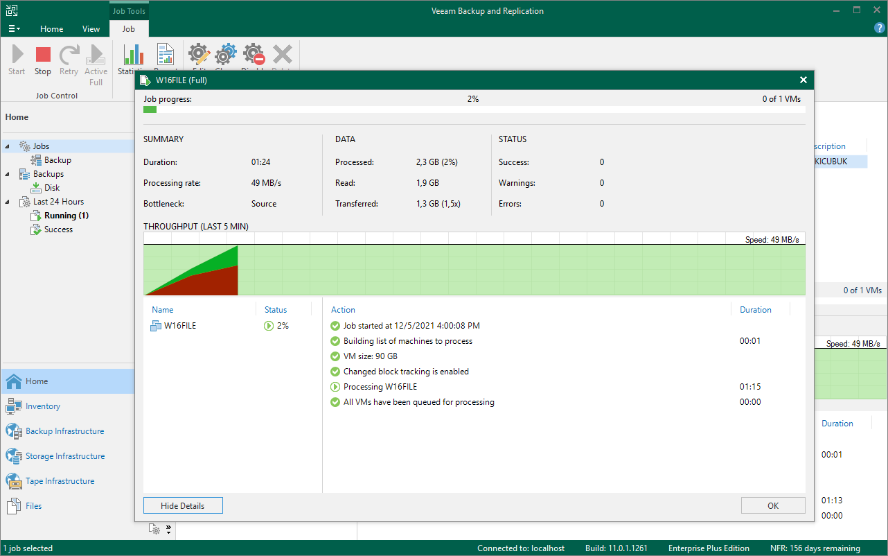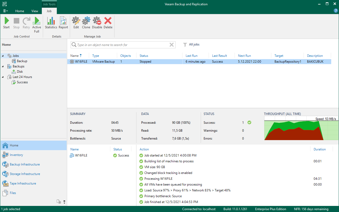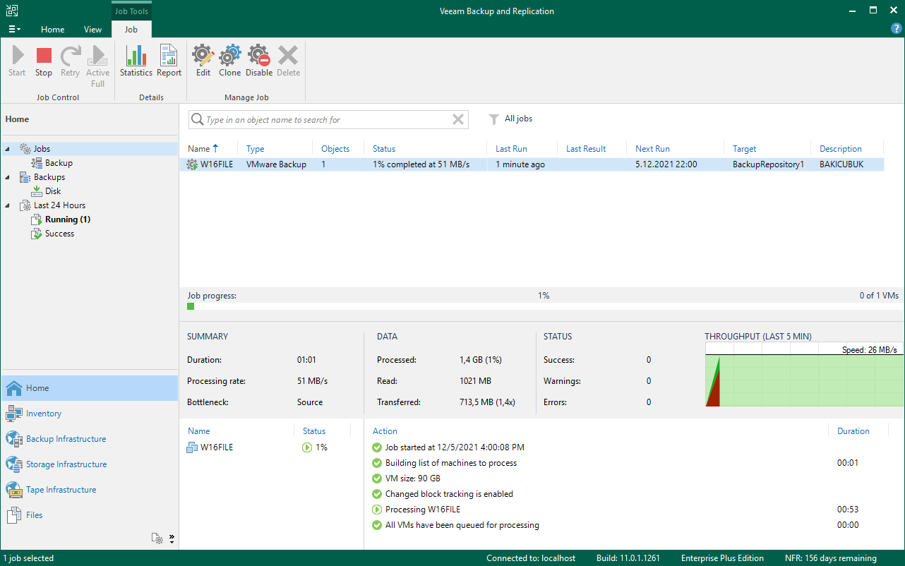 Veeam Backup & Replication 11 konsolunu tekrar geri döndüğümüz de yapılandırmış olduğumuz W16FILE isimli Virtual Machine (Sanal Makine ) için yapılandırmış olduğumuz Backup Job’ın Jobs bölümü altında Just now olarak görüyoruz.
