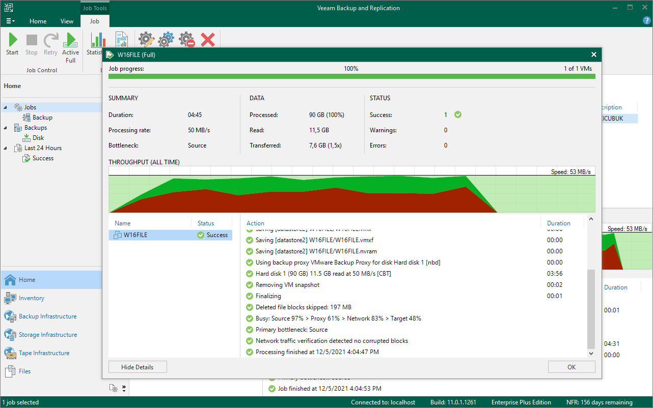 Veeam Backup & Replication 11 konsolun da VMware ESXi ( Standalone ) yapımız üzerinde bulunan W16FILE isimli Virtual Machine (Sanal Makine ) için yapılandırmış olduğumuz Backup Job’ı Success ( Başarılı ) olarak tamamlandığını görüyoruz.