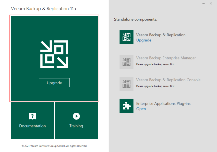 Veeam Backup & Replication 9.5 Update 4b ( 9.5.4.2866 ) sunucumuz üzerinde Veeam Backup & Replication 11a Upgrade işlemini başlatmak için Upgrade diyoruz.