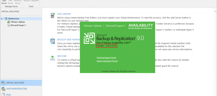 Veeam Backup & Replication v9.0 konsolunda Help menüsü altında bulunan About sekmesinden versiyonu kontrol ediyoruz. Veeam Backup & Replication v9.0 versiyonun 9.0.0.902 olarak görüyoruz.