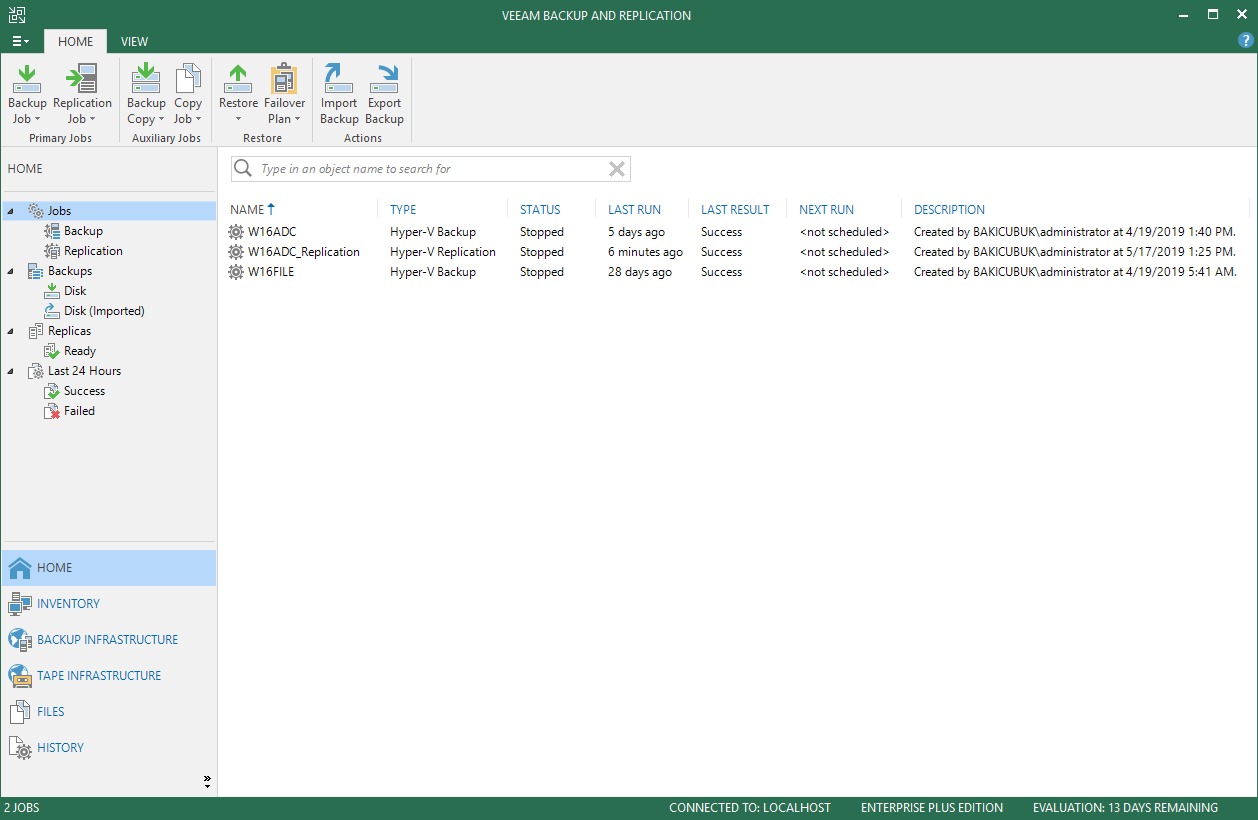 Veeam Backup & Replication v9.5 Update 4 konsolunda bulunan Replicas bölümün artık olmadığını görüyoruz. Çünkü Permanent Failover işleminden sonra artık Veeam Backup & Replication v9.5 Update 4 üzerinde Replication ( Replikasyon ) işlemini sonlandırmış olduk. Sadece Jobs sekmesin de Permanent Failover işleminden sonra daha önce yapılandırmanın durduğunu görüyoruz.