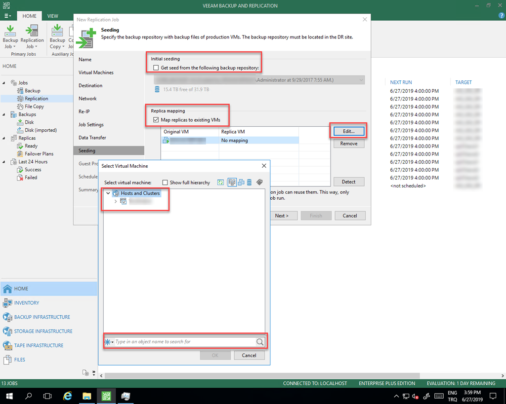 Bunun için “Map replicas to existing VMs” seçeneği işaretlendikten sonra makine seçilerek “Edit” seçeneği üzerine tıklanılır. Sonrasında Disaster Site üzerinde bulunan replike makine seçilir, kolaylık olması adına “Search” edilebilir.