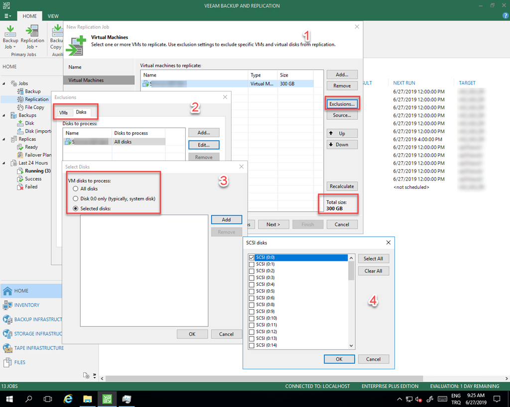 Örneğin bir Database makinesinin replikasyonunu gerçekleştireceğiz, bu makinenin disklerinden bir tanesi TempDB ve replikasyonunun yapılmasına gerek duyulmuyor ise bu diski replikasyonun dışında tutarak Bandwith ve job için tamamlanma süresinde ciddi bir kazanç elde edebiliriz. Benzer olarak makinemizin kullandığı pagefile dedike bir disk üzerinde çalışıyorsa bu tür disklerin replikasyon dışında tutulması aynı kazancı elde etmemizi sağlayacaktır. Disk seçiminin dışında job içerisinden VM/VMs seçerek istenilen süre boyunca replikasyonun dışında tutabiliriz.