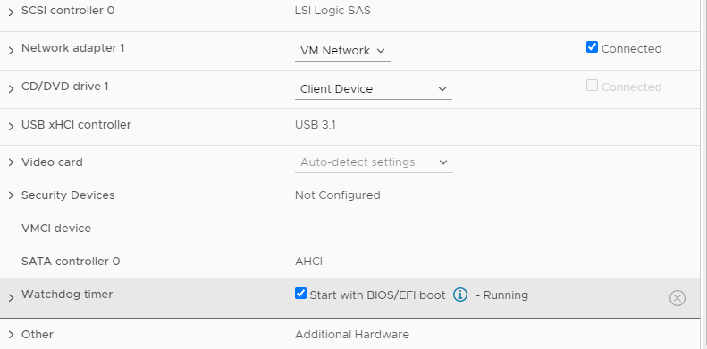 Watchdog device vSphere tarafından sağlanmakla birlikte ancak guest işletim sistemi tarafından yapılandırılırmaktadır. Bu özellik Microsoft spesifikasyonlarına dayanmaktadır: Watchdog Resource Table (WDRT) ve Watchdog Action Table (WDAT). Tipik olarak, modern guest işletim sistemleri Watchdog Action Table (WDAT) entegrasyonunu kullanmaktadır. Wdat ile alakalı minimum and maximum sayım değeri, timer resolution, some flags and other vendor/device bilgileri kulanımı için aşağıdaki parametreleri baz alabilirsiniz.