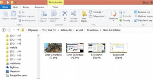 Windows 8’de Win + PrintScreen tuşlarını kullanarak ekran görüntüsü alabilirsiniz. Bu yolla aldığınız tüm ekran görüntüleri, C:\Kullanıcılar\[kullanıcı adınız]\Resimlerim\Ekran Görüntüleri” altına kaydedilecektir.
