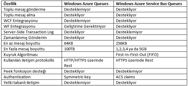 Windows Azure Platform içerisinde aynı uygulama domaininde çalışan, katmanlar arası iletişimin sağlanması amacı ile Windows Azure Storage içerisinde bulunan Queues nesnesi kullanılması önerilmektedir. Uygulama parçalarının dışı ya da iç sistemler ile iletişim sağlaması için Windows Azure ServiceBus Queues yaklaşımın kullanılması önerilmektedir. Windows Azure Platform ‘un desteklemiş olduğu Queues nesneleri ile ilgili bilgi ve karşılaştırma aşağıda bulunmaktadır.