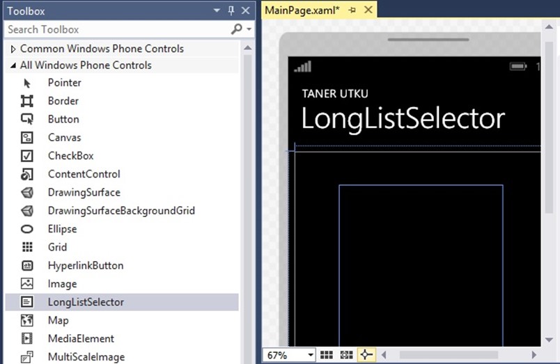 Ben bu yazımda basit bir şekilde verileri nasıl longlistselector ile kullanırız ondan bahsedeceğim. LongListSelector kullanarak bir takım kişilerin isim ve maillerini göstereceğim. Öncelikle boş bir proje açalım ve içine LongListSelector kontrolünü ekleyelim.