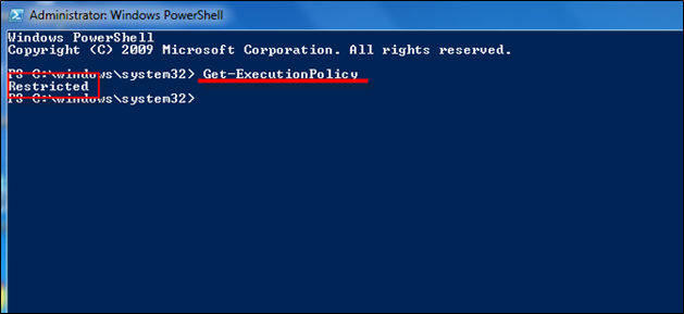 Powershell açıldıktan sonra “Get-ExecutionPolicy” komutunu giriyoruz ve Restricted yani kısıtlı cevabını alıyoruz. Bunu değiştirmemiz gerekiyor.