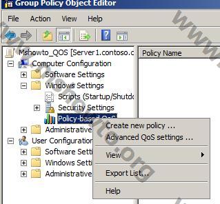 6) Sırada Server’ımızda QoS policy oluştururarak belli bir sınırı geçen network trafiğini engelleyeceğiz. Bu işlemi yapabilmek için SRV’ye log on olun. Start, Run GPMC.MSC yazıp Enter tuşuna basın. Group Policy Management Console’dan Domain’inizi seçin. Action menüsünden New Organizational Unit seçeneğine tıklayın ve bir OU oluşturun. Oluşturduğunuz OU’ya tıklayın ve Action menüsünden Create a GPO in this domain, and Link it here seçeneğine tıklayın. Oluşturduğunu yeni policy’de policy-based QoS seçeneğine sağ tıklayarak Create new policy seçeneği ile yeni bir QoS policy için sihirbazı başlatın.