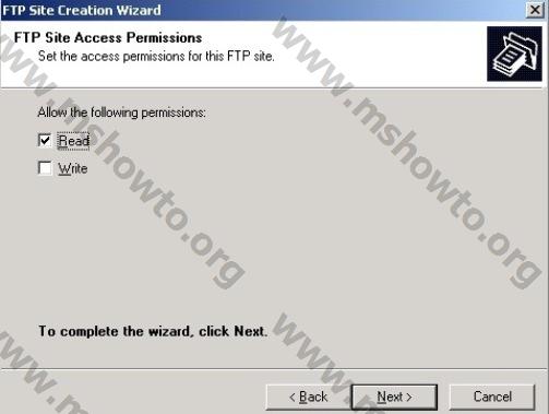Eğer bu Ftp Sitesini sadece download amaçlı kullanacaksanız Read izni işimizi görecektir, download işlemi dışında upload işleminide gerçekleştirmek istiyorsanız Write iznini de aktif hale getirerek Next diyoruz,