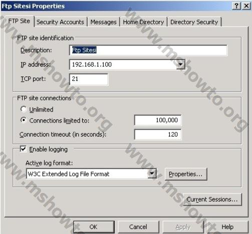 12.) İşlemimiz tamamlandıktan sonra oluşturduğumuz Ftp Sitesinin özelliklerini incelediğimizde aşağıdaki ekran görüntüsü karşımıza çıkacaktır. Bu ekranda 5 farklı sekme yer alıyor. Bu sekmelerden yararlanarak Ftp Sitenizle ilgili ayar değişiklikleri yapabilirsiniz.
