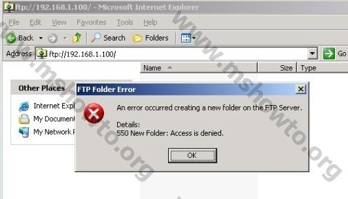 13.) Şimdi ise oluşturduğumuz Ftp Sitesinin sağlıklı hizmet verip vermediğini kontrol etmek için IE ara yüzünde URL adres satırına ftp://192.168.1.100 yazıp sayfanın görüntülenmesi için enter diyoruz. Bu işlem ile Ftp Sitesinin hizmet verdiğini göreceksiniz. Şuanda Ftp Sitesi için oluşturduğumuz klasör boş olduğu için boş bir sayfa görüntülenecektir. Bu klasör içerisine dosya upload işlemini yapmak istediğimizde aşağıdaki resimdeki gibi yetki hatası verecektir. Hatırlarsanız Ftp Sitesini oluştururken erişim izni bölümünde sadece Read izni vermiştik ve bu nedenden dolayı şimdi upload yapamadık.