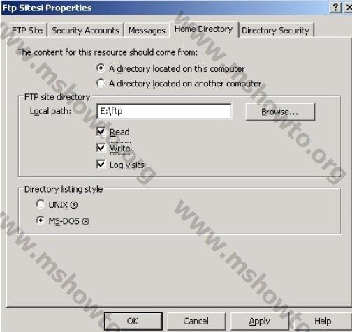 14.) Bu problemi aşmak için oluşturduğumuz Ftp Sitesi özelliklerinde yer alan Home Directory sekmesinde bulunan Read iznine ek olarak Write iznini veriyoruz.