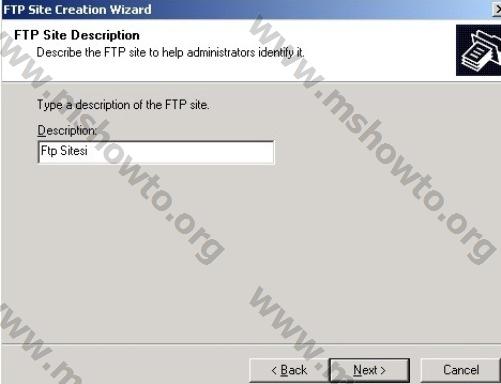 6.) Ftp Site Description ekranında oluşturacağımız Ftp Sitesi için bir açıklama giriyoruz. Birden fazla Ftp Sitesi oluşturmamız durumunda siteleri bir birinden ayırabilmemiz için sağlıklı bir açıkla girmemizde yarar var.