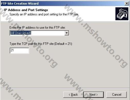 7.) Ip Address and Port Settings ekranında varsayılan olarak Ftp Sitesinin hangi porttan hizmet vereceği geliyor, bu bölümde ek olarak tanımlamamız gereken bilgi bu hizmetin kurulu olduğu sunucunun ip adresini tanımlamak. Gerekli bilgiyi tanımladıktan sonra Next diyoruz,