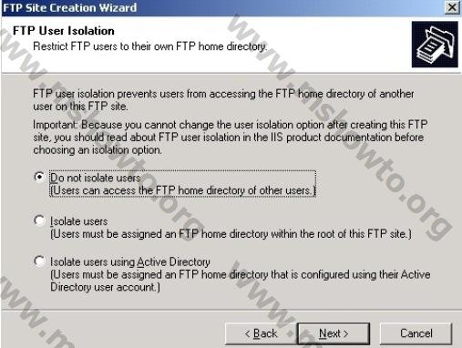 8.) Ftp User Isolation ekranında birinci seçenek olan Do not isolate users seçeneğini seçerek Next diyoruz,