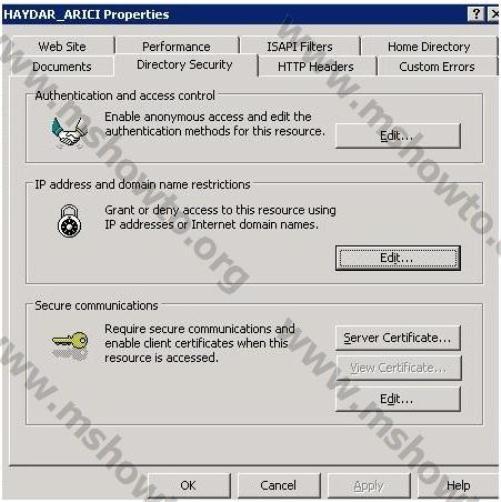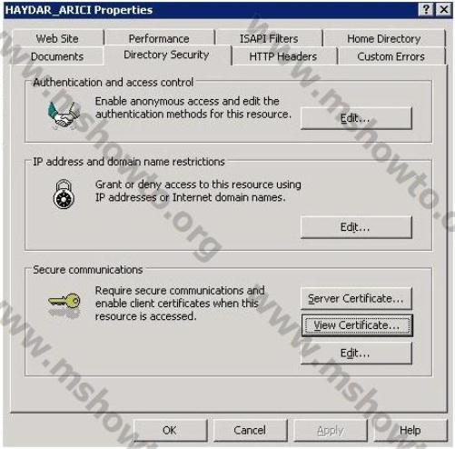 11.) Oluşturduğumuz sertifikayı kontrol etmek için ise ilgili web sitenin özelliğinde yer alan sekmelerden Directory Security sekmesinde bulunan Secure Communications bölümünde hizmet veren View Certificate butonuna basıyoruz.
