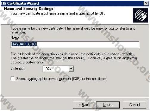 4.) Gelen ekrana Name bölümüne bir isim ve Bit length değerini belirterek işlemimize Next ile devam ediyoruz,