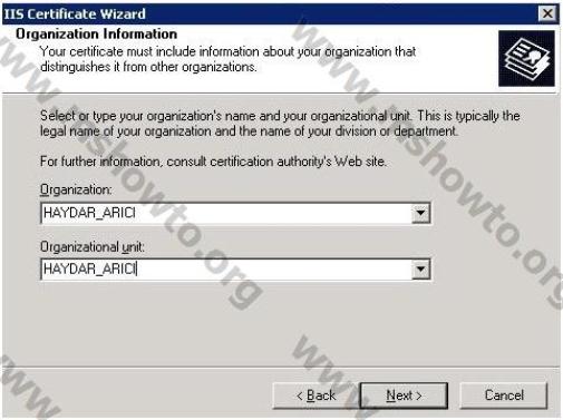 5.) Organization Information ekranında organizasyon bilgisi tanımlayıp Next diyoruz,