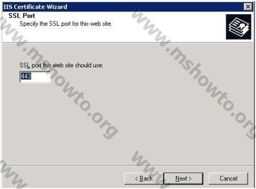 8.) SSL Port ekranında varsayılan olarak 443 portu geliyor, değişiklik yapmadan bir sonraki aşamaya geçmek için Next diyoruz,