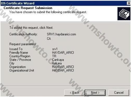 10.) Son olarak bu aşamaya kadar yaptıklarımızın özet bilgisini gösteren ekran karşımıza geliyor, bu bilgiler doğru ise Next ile sonraki aşamaya geçerek sertifika talebini başarılı bir şekilde
