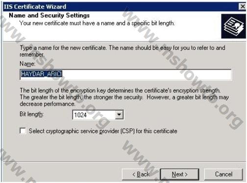6.) Bu ekranda ise sertifika talebinde bulunacağımız şifrenin oluşturulacağı dosya adı, uzantısı ve kaydedileceği yeri belirtiyoruz.