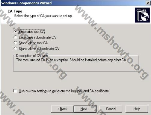 2.) CA Type ekranında Enterprise root CA seçeneğini seçerek Next diyoruz,