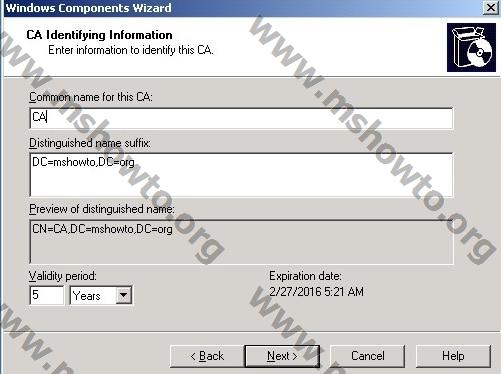 3.) CA Identifying Information ekranında Common name kısmına bir isim belirterek Next diyoruz,