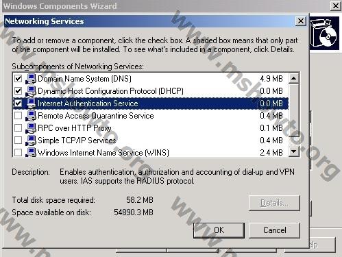 5.) Şimdi ise Internet Authentication Service bileşenini kuracağız.Bunun için yine aynı ekranda Networking Services altında hizmet veren “Internet Authentication Service” seçeneğini aktif hale getirerek Ok diyoruz ve kurulum işlemini tamamlamak için gelen ekranda Next ile devam ederek kurulum işlemini tamamlıyoruz.