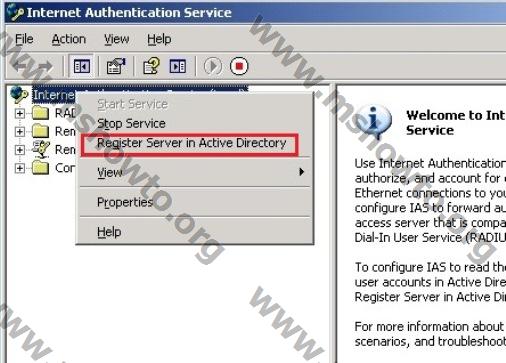 7.) Öncelikli olarak yapmamız gereken artık Internet Authentication hizmetini Active Directory ‘e kaydını yapmamız gerekiyor. Bu işlem için yönetim konsolundayken Internet Authentication Services üzerinde sağ buton > Register Server in Active Directory diyoruz ve gelen ekranları Ok ile onaylıyoruz.