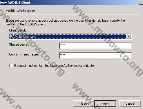 10.) Gelen ekranda Client Vendor kısmına “ Radius Standart “ seçerek alt kısımda yer alan “Shared secret” bilgilerini belirterek Next diyoruz, bu işlemle birlikte Radius Client oluşturma işlemimiz tamamlandı.
