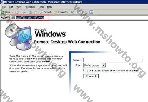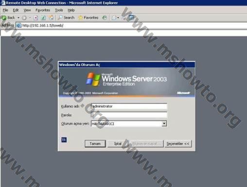 8.) Sıra geldi Internet Explorer aracılığı ile Remote Desktop Web Connection programını kullanmaya. Bunun için Internet Explorer proğramını  açıyoruz ve adres satırı bölümüne http://192.168.1.5/tsweb yazıyoruz. Burada ip adresi belirttiğimiz bölüm Remote Desktop Web Connection bileşenini kurduğumuz sunucu ip adresidir.