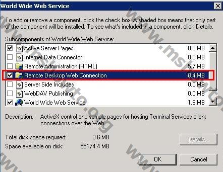 5.) World Wide Web Services  bileşeni altında Remote Desktop Web Connection seçeneğini aktif hale getirerek OK  butonuna basıyoruz ve daha önce karşılaştığımız ekranlara onay vererek işlemimize devam ediyoruz,