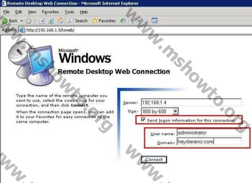 9.) Remote Desktop Web Connections programı sorunsuz olarak çalışıyor.  Bu arayüz üzerinden hangi istemci ya da sunucuya bağlanmak istiyorsak Server  bölümüne ip adresi ya da ismini yazıyoruz. Bu tanımlamadan sonra Size (büyüklük)  bölümünden gerekli ekran ayarını yapıyoruz, Send logon information for this connection ( Bu bağlantı için oturum açma bilgilerini gönder ) seçeneğini aktif hale getirerek  bağlantı için oturum açma bilgilerini  tanımlıyoruz ve Connect  butonuna basıyoruz,
