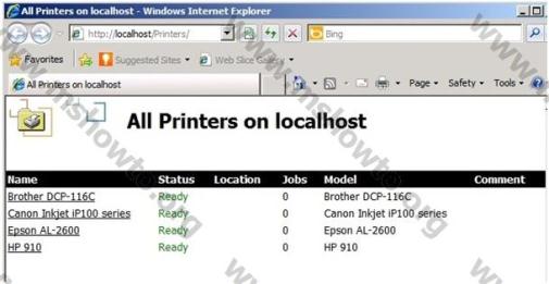 7.)Kurulum yaptığımız sunucu üzerinden erişim sağlama için IE adres satırına http://localhost/Printers yazarak sayfanın görüntülenmesini sağlıyoruz. Bu işlem ile ilgili sunucu üzerinde kaç tane yazıcı ve paylaşıma açılmış ise o listesi IE ara yüzden görüyoruz.