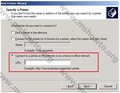 9.) Önemli olan son kullanıcılara ait bilgisayarların bu hizmetten yararlanmasını sağlamak. Bu işlem için Yazıcı ekleme bölümüne gelerek lokal değil network seçeneğini seçiyoruz ve Next diyoruz. Bir sonraki ekranda ise yazıcı erişim adresini URL satırı karşısına yazıp Next diyerek yazıcı tanımlama işlemini tamamlıyoruz.
