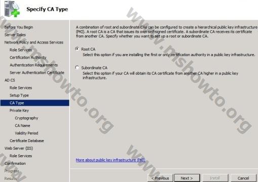 12.) Specify CA Type ekranında etki alanı içerisinde daha önce bir sertifika yöneticisi kurmadığımız  için Root CA (Kök) seçeneğini seçerek Next diyoruz.