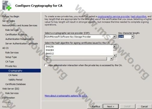 14.)  Configure Cryptography for CA ekranında yapılacak olan şifreleme yapılandırmasını yapabilme olanağına sahibiz. Eğer varsayılan değerler dışında bir yapılandırma yapmak istiyorsanız burada değişiklik yapabilirsiniz. Burada varsayılan değerler dışına çıkmadan Next diyerek işlemimize devam ediyoruz,