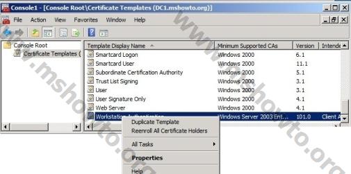 24.) Active Directory Users and Computers da yapılacak işlemleri yaptık. Şimdi ise Sertifika Yöneticisinde bir takım işlemler yapacağız. Sertifika Yöneticisi olarak yapılandırdığımız sunucuda sertifika şablonlarına erişmek için Start > Run > mmc yazıp Enter diyoruz. Gelen konsol ekranında File > Add / Remove Snap-in bölümüne gelerek Certificate Template ekliyoruz. Gelen ekranda Workstation Authentication üzerinde sağ buton > Duplicate Template seçerek bu sertifika seçeneğinin açılmasını sağlıyoruz. Bu işlem ile gelen ekranda sertifikanın Windows Server 2003 Enteprise ya da Windows Server 2008 Enterprise işletim sisteminde yayınlanmasını sağlayabiliriz. Burada Windows Server 2008 Enterprise seçeneğini seçerek OK diyoruz.