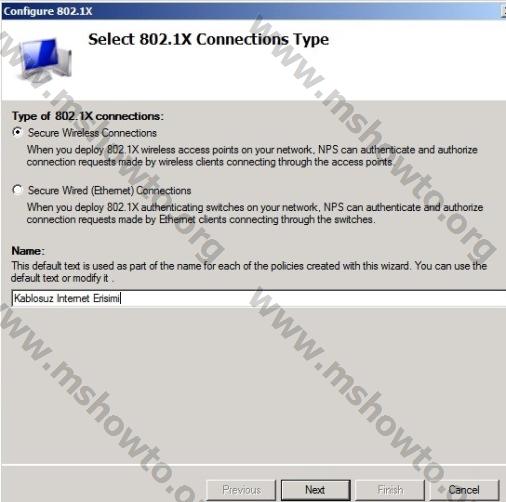 30.) Select 802.1x Connections Type ekranında gelen seçeneklerden Secure Wireless Connections seçeneğini seçip Name bölümüne isim belirterek Next diyoruz.