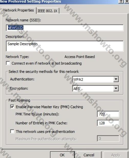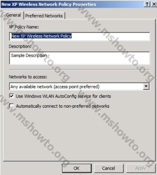 39.) Yapılandırmamızın son aşamasına geldik. Şimdi ise kullanıcı bilgisayarlarının kablosuz internet ayarlarını otomatik olarak 802.1x yapılandırılabilmesi için grup ilkesinden yararlanacağız. Bu işlem için Administrator Tools da Group Policy Management konsolunu açıyoruz. Gelen ekranda Computer Configration > Policies > Windows Settings > Security Settings > Wireless Network kabı üzerinde sağ buton gelen menuden Create a New Windows Xp Policy seçerek işlemimize devam ediyoruz. Bu işlem ile yapılandıracağımız kablosuz erişim özellikleri karşımıza çıkacaktır. General sekmesinde genel bilgileri tanımladıktan sonra Preferred Networks sekmesine geçiyoruz.