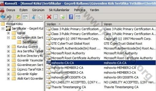 a.) Kullanıcı bilgisayarlarına sertifikanın otomatik olarak yüklenip yüklenmediğini kontrol etmek için sertifikalar bölümünün kontrol edilmesi,