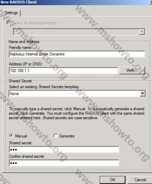 31.) Bu işlem ile birlikte Radius Client ları tanımlayacağımız ekran geliyor. Burada Radius Client ları tanımlayarak işlemimize OK ile devam ediyoruz. Burada dikkat etmeniz gereken nokta , Radius yapılandırması yaptığınız donanımın ip adresini buraya tanımlıyorsunuz (Access Point vb.). Bu işlem ile Radius Client ‘ın tanımlandığını göreceksiniz.