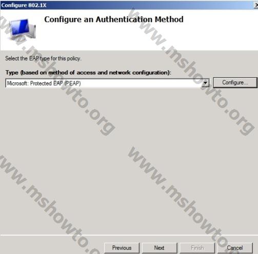 32.) Tekrar Specify 802.1x Switches ekranına geliyoruz, bu ekranda Next diyerek yapılandırma işlemine devam ediyoruz. Configure an Authentication Method ekranında ise yapılacak bağlantı sırasında kullanılacak kimlik doğrulama yöntemini belirliyoruz (PEAP) ve Next diyoruz.