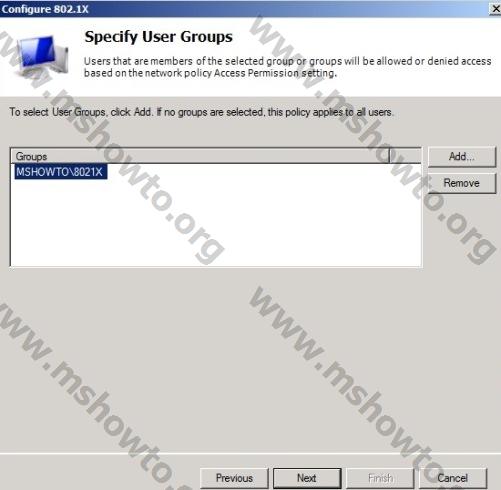 33.) Specify User Groups ekranında Active Directory Users and Computers da oluşturduğumuz 8021x grubunu ekleyerek Next diyoruz.