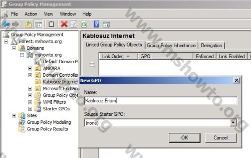 36.) Certificate Authority , Active Directory Users and Computers ve Network Policy Services de yapılandırmamızı tamamladık. Son olarak kullanıcıların bilgisayarlarına kimlik doğrulama sertifikaların otomatik kaydedilmesi ve son kullanıcıların bilgisayarlarında kablosuz internet ayarlarında erişim ayarlarının otomatik olarak yapılması için Group Policy ayarlarından yararlanacağız. Bu işlem için Administrator Tools da yer alan Group Policy Management konsolunu açıyoruz. Makalenin başında hatırlarsanız Kablosuz Internet isminde bir yapısal birim (OU) yeni bir grup ilkesi oluşturuyoruz ve adını Kablosuz Erişim verip onaylıyoruz.