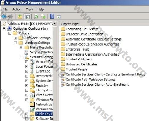 37.) Gelen ekranda Computer Configration > Policies > Windows Settings > Security Settings > Public Key Policies kabına geliyoruz. Ekranın sağ tarafında yer alan Certificate Services Client – Auto – Enrollment seçeneğini çift tıklayarak parametrelerin görünmesini sağlıyoruz.